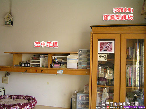 把原先的雜物整理一下,放上沒有在用的組合書架邊板,空中走道就完成了