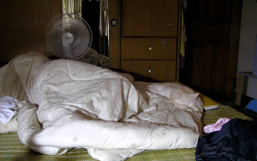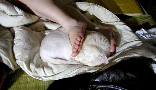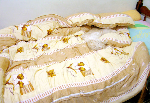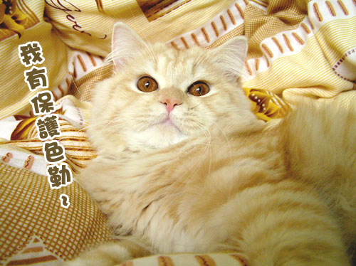颱風天因為下雨變冷,所以飛踢也跳上床睡了猜猜他在哪裡?因為毛色又白又黃,所以直接融入棉被裡晚上要是沒看清楚的話,飛踢可能會「噗啾」一聲被壓扁其實也發生過這樣的事啦....不過拍完照就把象腿移開了,還好飛踢還有呼吸 就是因為很容易融入黃色背景,但被套都是娘親在買所以沒得選只好睡覺前先巡一下飛踢的蹤影了 自豪嗎?就是這樣你才容易被壓阿!!!