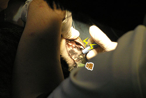 趁著他不醒人事的時候就趕快用突破天際的鑽頭把他的牙齒鑽一鑽