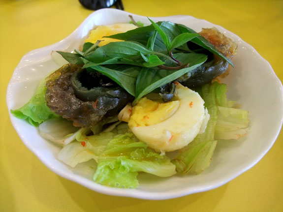 炸過的皮蛋配上九層塔和酸辣醬,味道還蠻新奇的