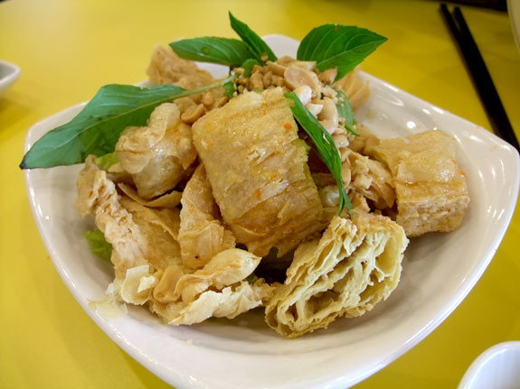 炸的香酥的豆皮搭配花生和九層塔再沾點盤底的醬汁,味道相當棒,是當天評價最好的一道菜