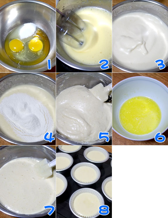 5.將麵糊倒入鋪了油力士紙模的布丁杯中8分滿