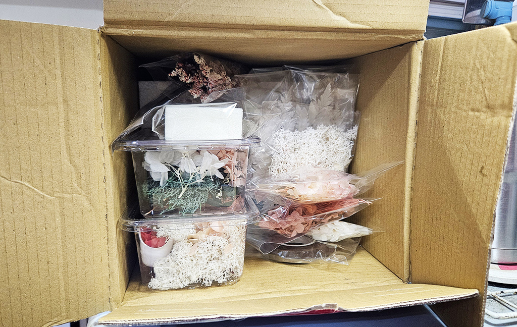 上網採購了永生花材和玻璃盅(直徑15cm),滿滿一箱不到一千二,還一直口誤成往生花(汗)