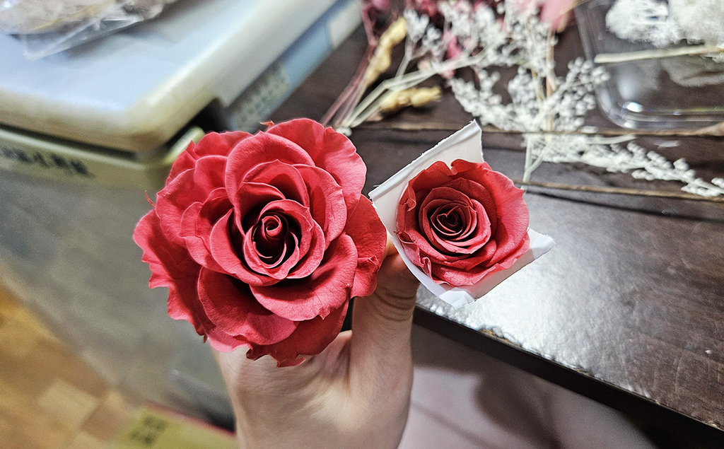 原來永生玫瑰還要經過開花儀式,這邊選擇了熱熔膠+塞棉花的混和型