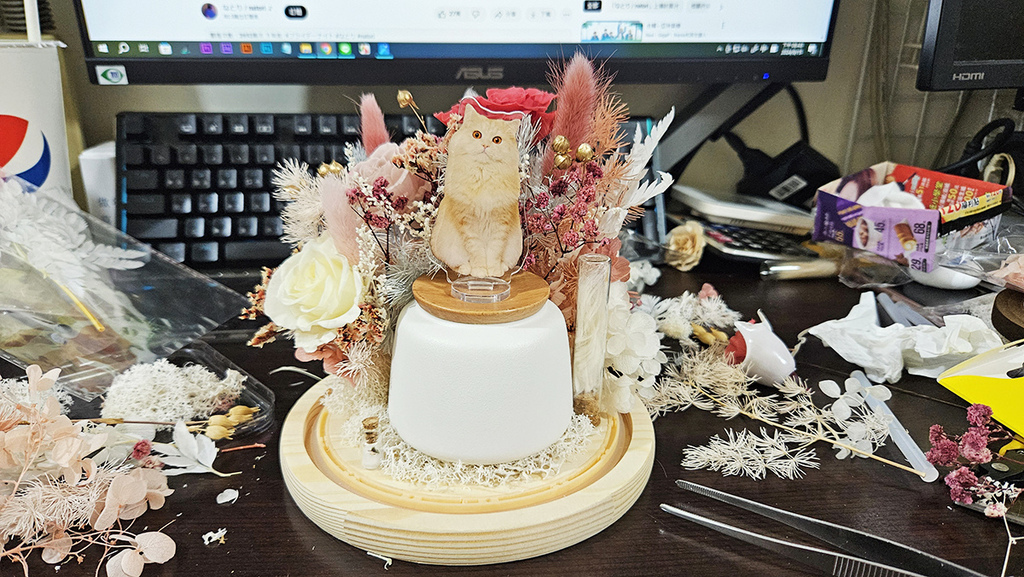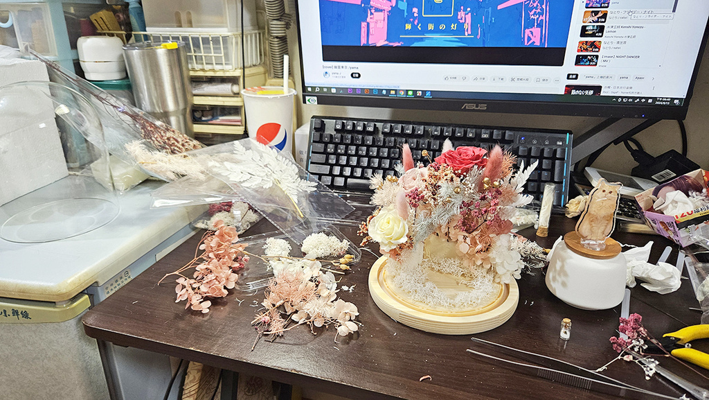 完全沒接觸過花藝的新手,看了幾個永生花教學影片後就直接上場